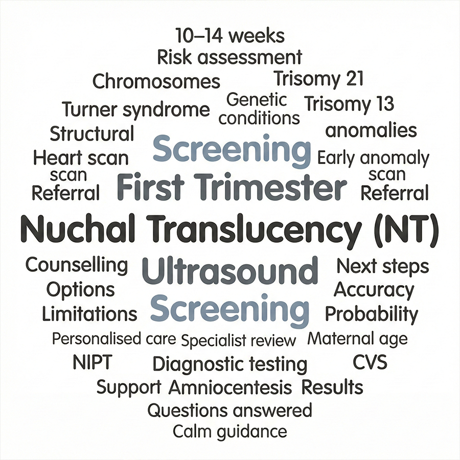 With the SMART NT pathway at 10 weeks, we deliberately bring the detailed scan and NT measurement earlier, in a centre experienced in early fetal anatomy. This allows earlier reassurance when everything looks normal, earlier use of NIPT (including extended or monogenic options where appropriate), and earlier identification of babies who may need targeted follow-up such as heart scans and detailed anatomy scans around 12–13 weeks, or diagnostic testing.